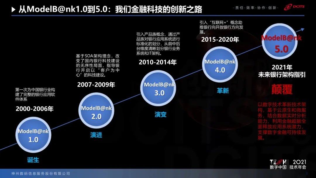 国家提出的信创工程,今年有120家银行单位参与到信创的试点当中,也为我们提出了新的命题,就是如何保证在科技架构下保障国家安全体系的建设。基于科技的变化以及银行业的变化,我们推出了ModelB@nk5.0。