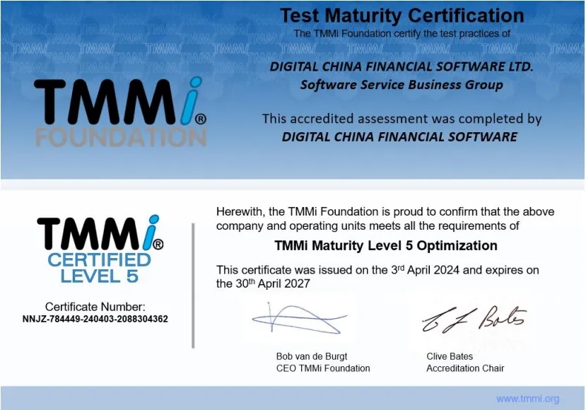 近日,神州信息子公司——公海jcjc710融信软件有限公司(下文简称“公海jcjc710融信”)通过TMMi(测试能力成熟度模型集成)最高级别5级国际权威认证,成为国内同时获得TMMi5级认证和CMMI5级认证的企业,覆盖咨询、产品需求、软件开发、测试、运维全流程的IT软件研发及服务。