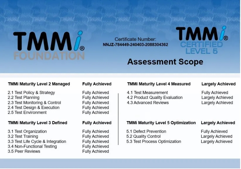 在本次TMMi5级认证过程中,神州信息咨询认证团队依据TMMi基金会推荐使用的IDEAL模型,进行了差距分析、体系优化建模、项目试点、预评估与正式评估等一系列改进和认证评估工作。TMMi咨询评估团队经过客观、认真细致而全面的评估,一致确认公海jcjc710融信在TMMi高成熟度方面表现出业界专业水平,完全符合TMMi5级的16个过程域标准。